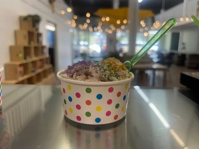 The Large Cup is two 4 oz scoops of your favorite gelato flavor served in a demon purple polka dotted cup with gelato spoon!